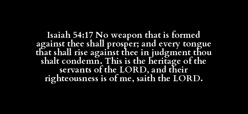 Isaiah 54:17 No weapon that is formed against thee shall prosper; and every tongue that shall rise against thee in judgment thou shalt condemn. This is the heritage of the servants of the LORD, and their righteousness is of me, saith the LORD.