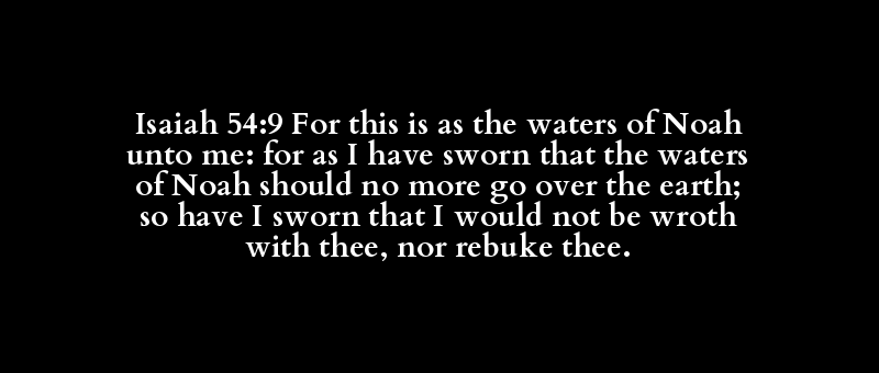 Isaiah 54:9 For this is as the waters of Noah unto me: for as I have sworn that the waters of Noah should no more go over the earth; so have I sworn that I would not be wroth with thee, nor rebuke thee.