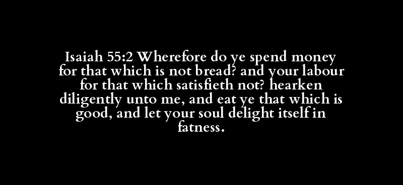 Isaiah 55:2 Wherefore do ye spend money for that which is not bread? and your labour for that which satisfieth not? hearken diligently unto me, and eat ye that which is good, and let your soul delight itself in fatness.