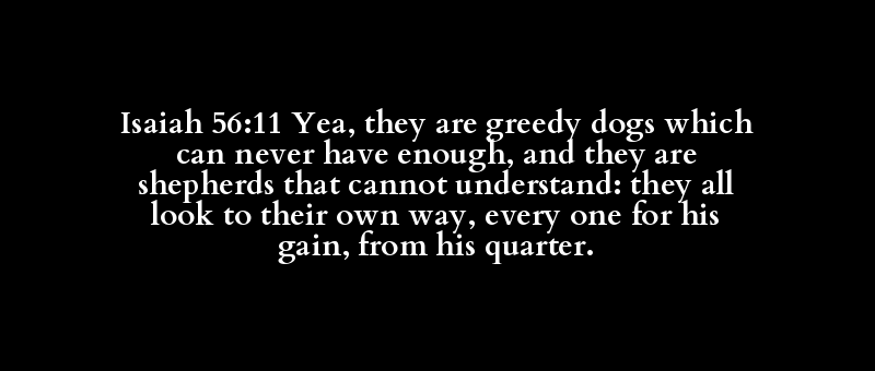 Isaiah 56:11 Yea, they are greedy dogs which can never have enough, and they are shepherds that cannot understand: they all look to their own way, every one for his gain, from his quarter.