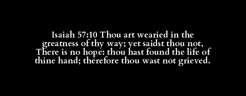 Isaiah 57:10 Thou art wearied in the greatness of thy way; yet saidst thou not, There is no hope: thou hast found the life of thine hand; therefore thou wast not grieved.