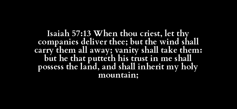 Isaiah 57:13 When thou criest, let thy companies deliver thee; but the wind shall carry them all away; vanity shall take them: but he that putteth his trust in me shall possess the land, and shall inherit my holy mountain;