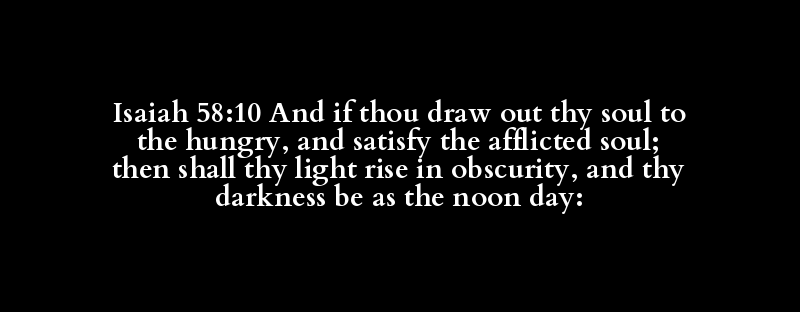 Isaiah 58:10 And if thou draw out thy soul to the hungry, and satisfy the afflicted soul; then shall thy light rise in obscurity, and thy darkness be as the noon day: