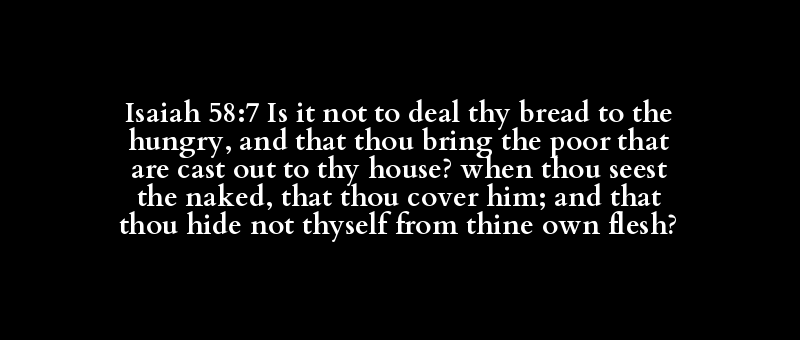 Isaiah 58:7 Is it not to deal thy bread to the hungry, and that thou bring the poor that are cast out to thy house? when thou seest the naked, that thou cover him; and that thou hide not thyself from thine own flesh?