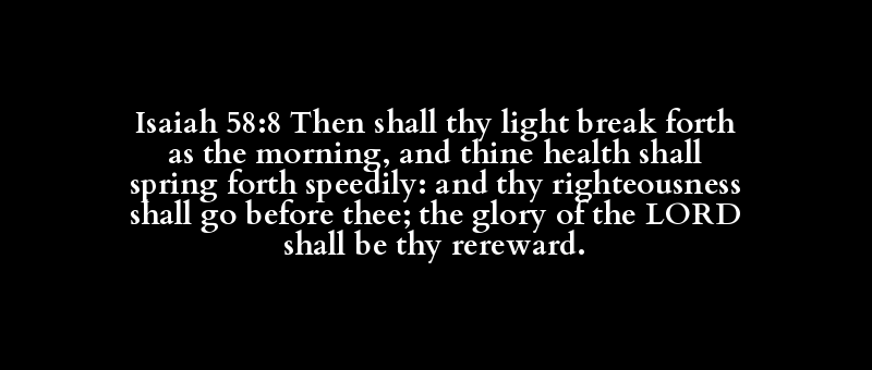 Isaiah 58:8 Then shall thy light break forth as the morning, and thine health shall spring forth speedily: and thy righteousness shall go before thee; the glory of the LORD shall be thy rereward.