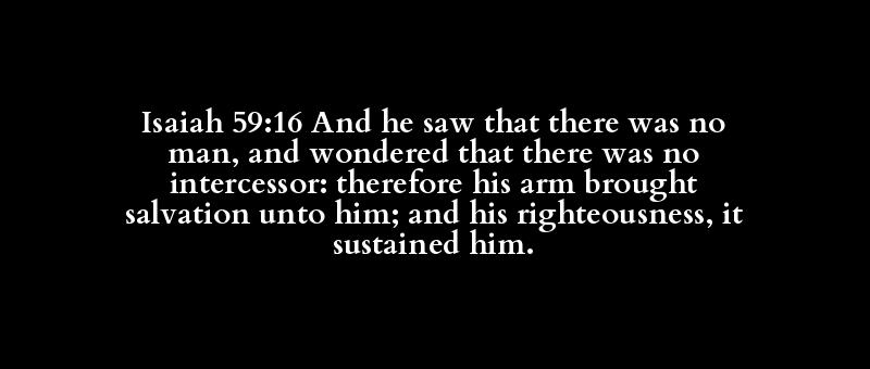 Isaiah 59:16 And he saw that there was no man, and wondered that there was no intercessor: therefore his arm brought salvation unto him; and his righteousness, it sustained him.