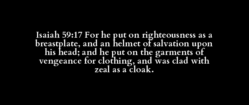 Isaiah 59:17 For he put on righteousness as a breastplate, and an helmet of salvation upon his head; and he put on the garments of vengeance for clothing, and was clad with zeal as a cloak.