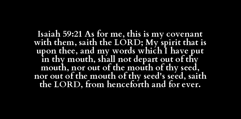 Isaiah 59:21 As for me, this is my covenant with them, saith the LORD; My spirit that is upon thee, and my words which I have put in thy mouth, shall not depart out of thy mouth, nor out of the mouth of thy seed, nor out of the mouth of thy seed's seed, saith the LORD, from henceforth and for ever.