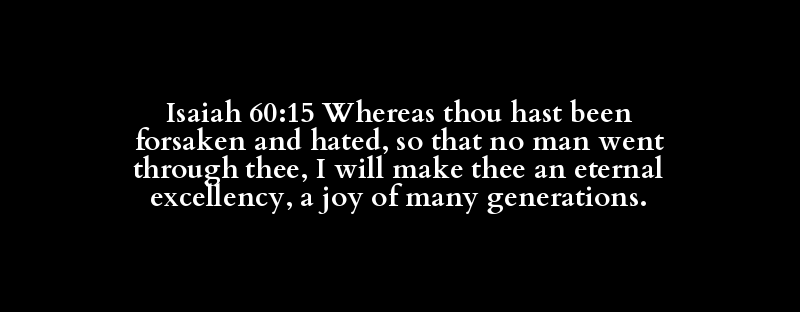 Isaiah 60:15 Whereas thou hast been forsaken and hated, so that no man went through thee, I will make thee an eternal excellency, a joy of many generations.