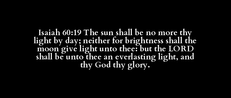 Isaiah 60:19 The sun shall be no more thy light by day; neither for brightness shall the moon give light unto thee: but the LORD shall be unto thee an everlasting light, and thy God thy glory.