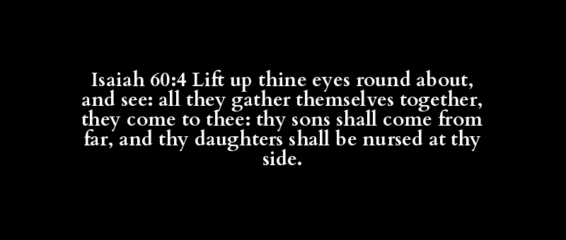 Isaiah 60:4 Lift up thine eyes round about, and see: all they gather themselves together, they come to thee: thy sons shall come from far, and thy daughters shall be nursed at thy side.