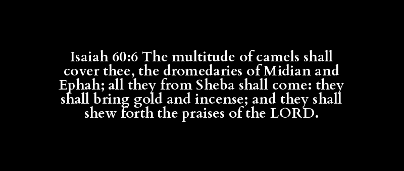Isaiah 60:6 The multitude of camels shall cover thee, the dromedaries of Midian and Ephah; all they from Sheba shall come: they shall bring gold and incense; and they shall shew forth the praises of the LORD.