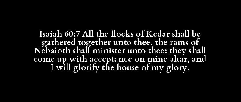 Isaiah 60:7 All the flocks of Kedar shall be gathered together unto thee, the rams of Nebaioth shall minister unto thee: they shall come up with acceptance on mine altar, and I will glorify the house of my glory.
