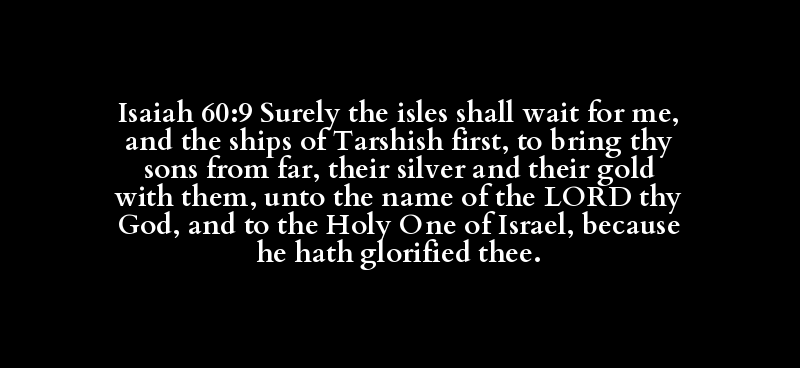 Isaiah 60:9 Surely the isles shall wait for me, and the ships of Tarshish first, to bring thy sons from far, their silver and their gold with them, unto the name of the LORD thy God, and to the Holy One of Israel, because he hath glorified thee.