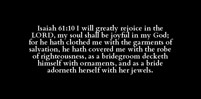 Isaiah 61:10 I will greatly rejoice in the LORD, my soul shall be joyful in my God; for he hath clothed me with the garments of salvation, he hath covered me with the robe of righteousness, as a bridegroom decketh himself with ornaments, and as a bride adorneth herself with her jewels.