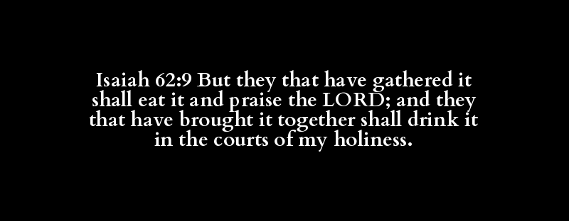 Isaiah 62:9 But they that have gathered it shall eat it and praise the LORD; and they that have brought it together shall drink it in the courts of my holiness.