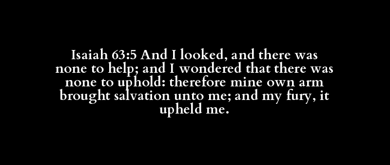 Isaiah 63:5 And I looked, and there was none to help; and I wondered that there was none to uphold: therefore mine own arm brought salvation unto me; and my fury, it upheld me.
