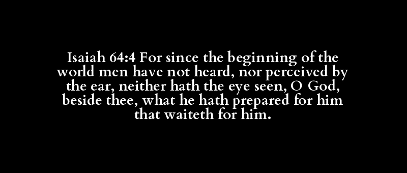 Isaiah 64:4 For since the beginning of the world men have not heard, nor perceived by the ear, neither hath the eye seen, O God, beside thee, what he hath prepared for him that waiteth for him.