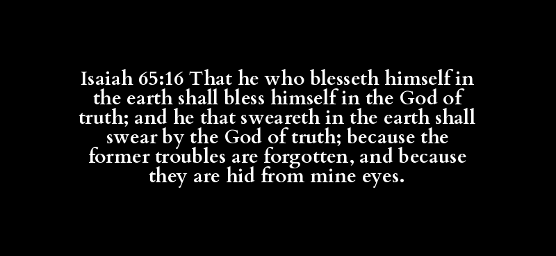 Isaiah 65:16 That he who blesseth himself in the earth shall bless himself in the God of truth; and he that sweareth in the earth shall swear by the God of truth; because the former troubles are forgotten, and because they are hid from mine eyes.