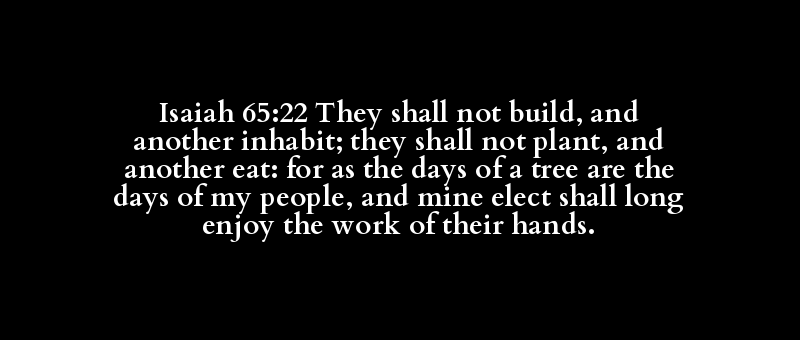 Isaiah 65:22 They shall not build, and another inhabit; they shall not plant, and another eat: for as the days of a tree are the days of my people, and mine elect shall long enjoy the work of their hands.