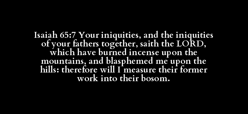 Isaiah 65:7 Your iniquities, and the iniquities of your fathers together, saith the LORD, which have burned incense upon the mountains, and blasphemed me upon the hills: therefore will I measure their former work into their bosom.
