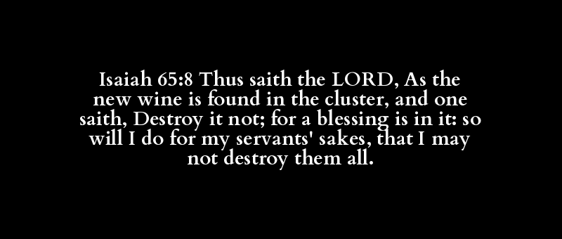 Isaiah 65:8 Thus saith the LORD, As the new wine is found in the cluster, and one saith, Destroy it not; for a blessing is in it: so will I do for my servants' sakes, that I may not destroy them all.