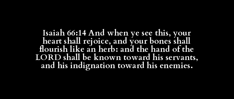 Isaiah 66:14 And when ye see this, your heart shall rejoice, and your bones shall flourish like an herb: and the hand of the LORD shall be known toward his servants, and his indignation toward his enemies.