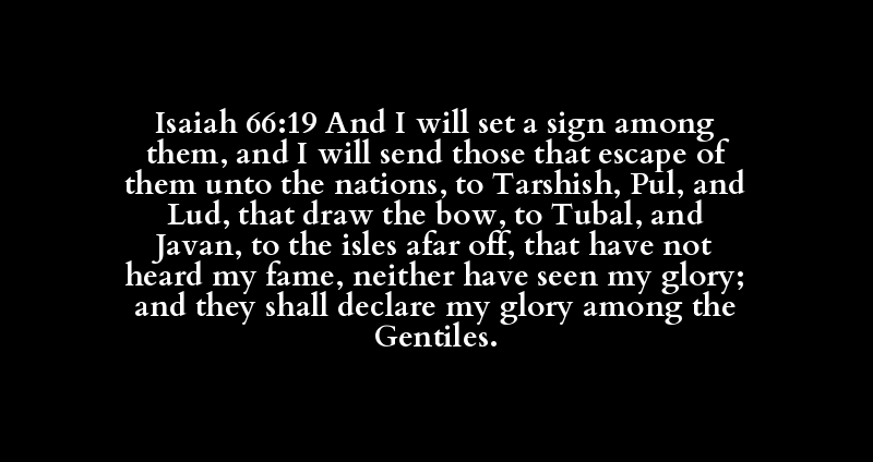 Isaiah 66:19 And I will set a sign among them, and I will send those that escape of them unto the nations, to Tarshish, Pul, and Lud, that draw the bow, to Tubal, and Javan, to the isles afar off, that have not heard my fame, neither have seen my glory; and they shall declare my glory among the Gentiles.
