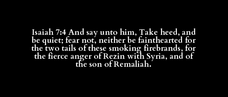 Isaiah 7:4 And say unto him, Take heed, and be quiet; fear not, neither be fainthearted for the two tails of these smoking firebrands, for the fierce anger of Rezin with Syria, and of the son of Remaliah.