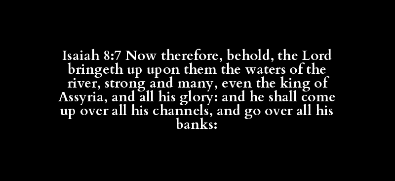 Isaiah 8:7 Now therefore, behold, the Lord bringeth up upon them the waters of the river, strong and many, even the king of Assyria, and all his glory: and he shall come up over all his channels, and go over all his banks: