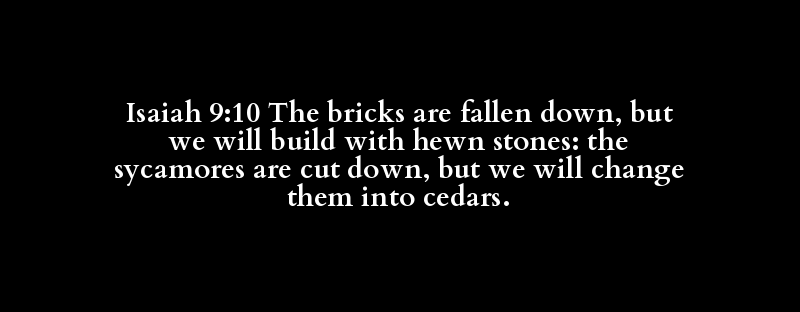 Isaiah 9:10 The bricks are fallen down, but we will build with hewn stones: the sycamores are cut down, but we will change them into cedars.