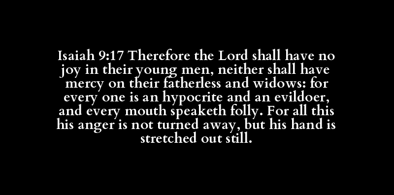 Isaiah 9:17 Therefore the Lord shall have no joy in their young men, neither shall have mercy on their fatherless and widows: for every one is an hypocrite and an evildoer, and every mouth speaketh folly. For all this his anger is not turned away, but his hand is stretched out still.