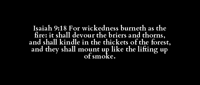 Isaiah 9:18 For wickedness burneth as the fire: it shall devour the briers and thorns, and shall kindle in the thickets of the forest, and they shall mount up like the lifting up of smoke.