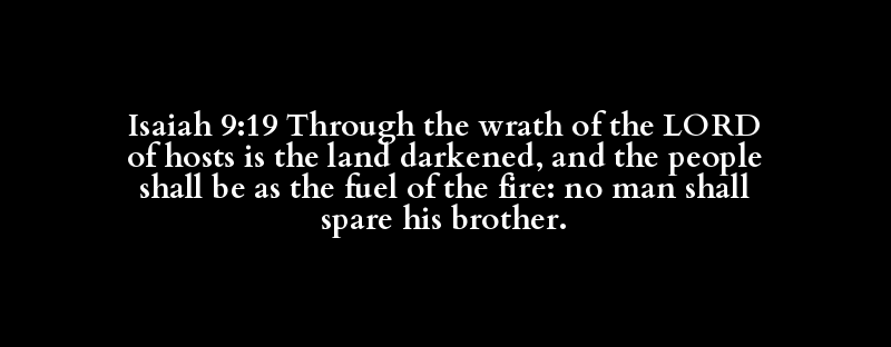 Isaiah 9:19 Through the wrath of the LORD of hosts is the land darkened, and the people shall be as the fuel of the fire: no man shall spare his brother.