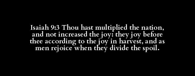 Isaiah 9:3 Thou hast multiplied the nation, and not increased the joy: they joy before thee according to the joy in harvest, and as men rejoice when they divide the spoil.