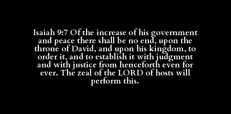 Isaiah 9:7 Of the increase of his government and peace there shall be no end, upon the throne of David, and upon his kingdom, to order it, and to establish it with judgment and with justice from henceforth even for ever. The zeal of the LORD of hosts will perform this.