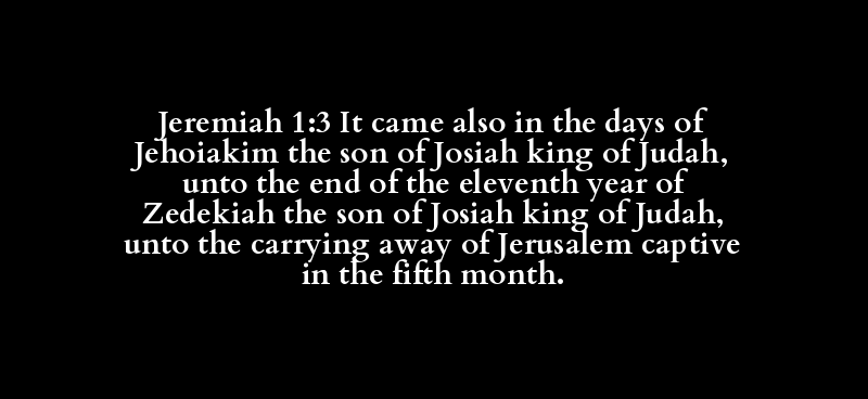 Jeremiah 1:3 It came also in the days of Jehoiakim the son of Josiah king of Judah, unto the end of the eleventh year of Zedekiah the son of Josiah king of Judah, unto the carrying away of Jerusalem captive in the fifth month.