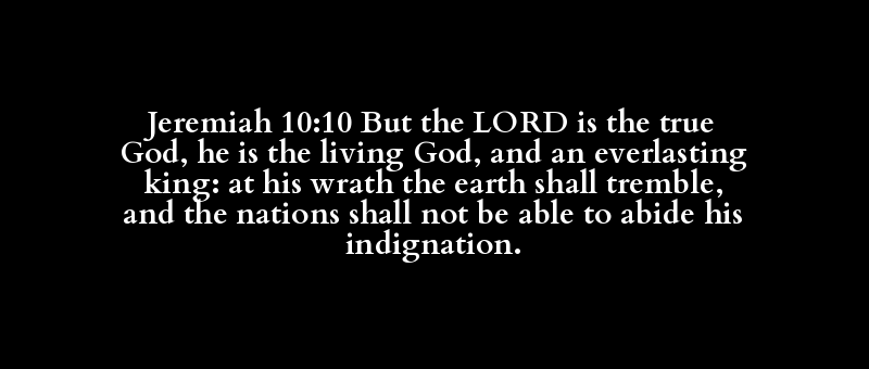 Jeremiah 10:10 But the LORD is the true God, he is the living God, and an everlasting king: at his wrath the earth shall tremble, and the nations shall not be able to abide his indignation.