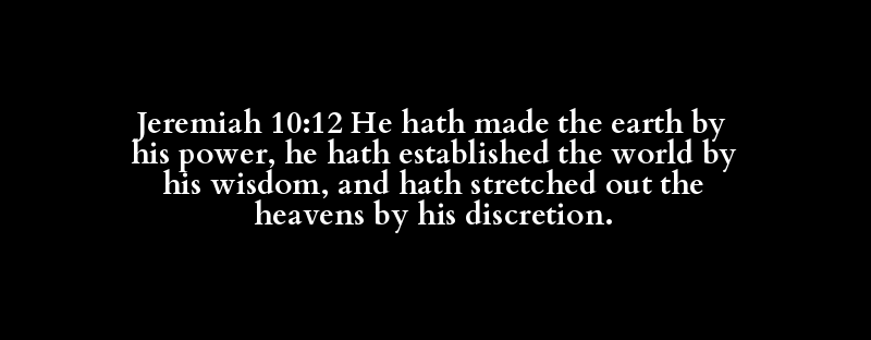 Jeremiah 10:12 He hath made the earth by his power, he hath established the world by his wisdom, and hath stretched out the heavens by his discretion.