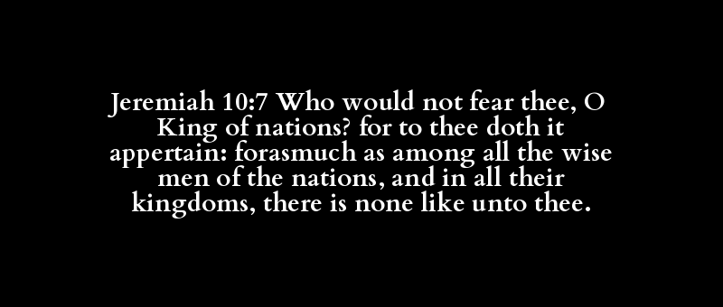 Jeremiah 10:7 Who would not fear thee, O King of nations? for to thee doth it appertain: forasmuch as among all the wise men of the nations, and in all their kingdoms, there is none like unto thee.