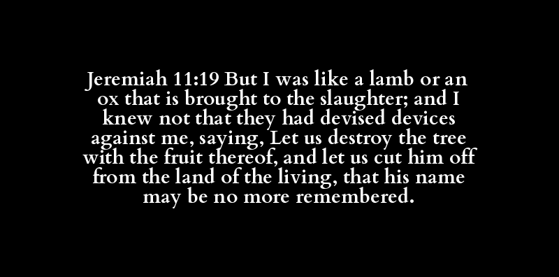 Jeremiah 11:19 But I was like a lamb or an ox that is brought to the slaughter; and I knew not that they had devised devices against me, saying, Let us destroy the tree with the fruit thereof, and let us cut him off from the land of the living, that his name may be no more remembered.