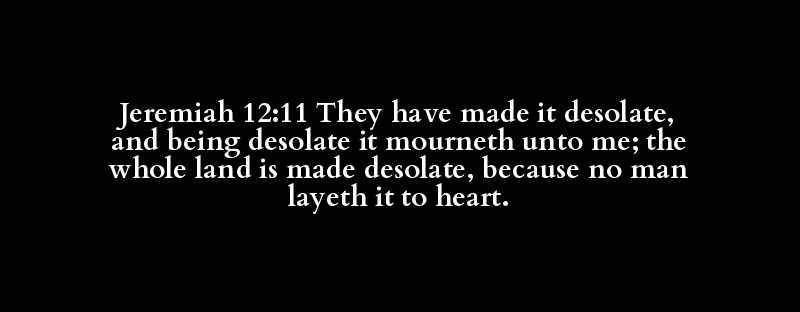 Jeremiah 12:11 They have made it desolate, and being desolate it mourneth unto me; the whole land is made desolate, because no man layeth it to heart.