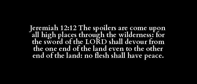 Jeremiah 12:12 The spoilers are come upon all high places through the wilderness: for the sword of the LORD shall devour from the one end of the land even to the other end of the land: no flesh shall have peace.