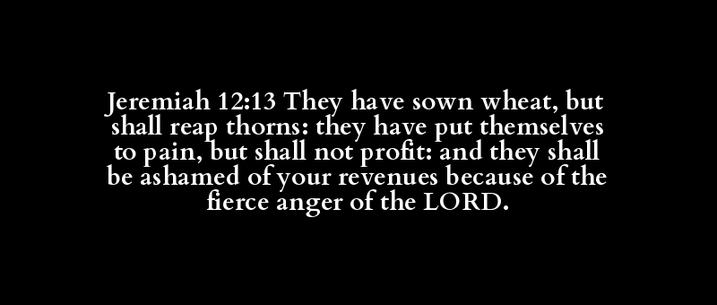 Jeremiah 12:13 They have sown wheat, but shall reap thorns: they have put themselves to pain, but shall not profit: and they shall be ashamed of your revenues because of the fierce anger of the LORD.