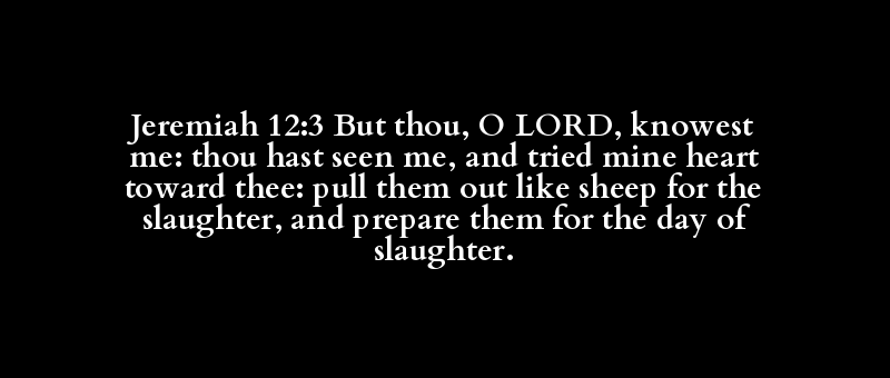Jeremiah 12:3 But thou, O LORD, knowest me: thou hast seen me, and tried mine heart toward thee: pull them out like sheep for the slaughter, and prepare them for the day of slaughter.