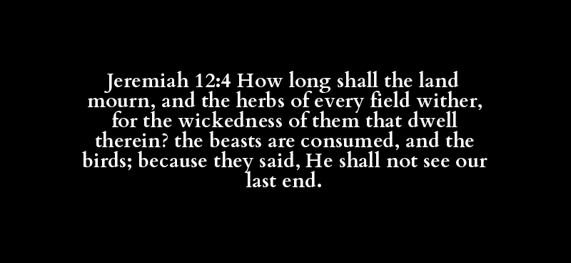 Jeremiah 12:4 How long shall the land mourn, and the herbs of every field wither, for the wickedness of them that dwell therein? the beasts are consumed, and the birds; because they said, He shall not see our last end.