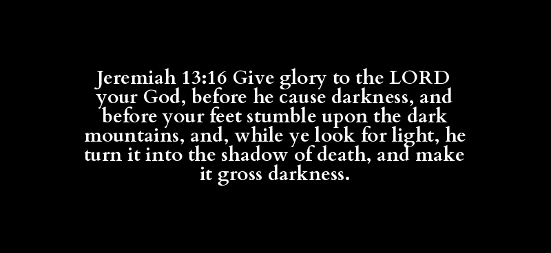 Jeremiah 13:16 Give glory to the LORD your God, before he cause darkness, and before your feet stumble upon the dark mountains, and, while ye look for light, he turn it into the shadow of death, and make it gross darkness.