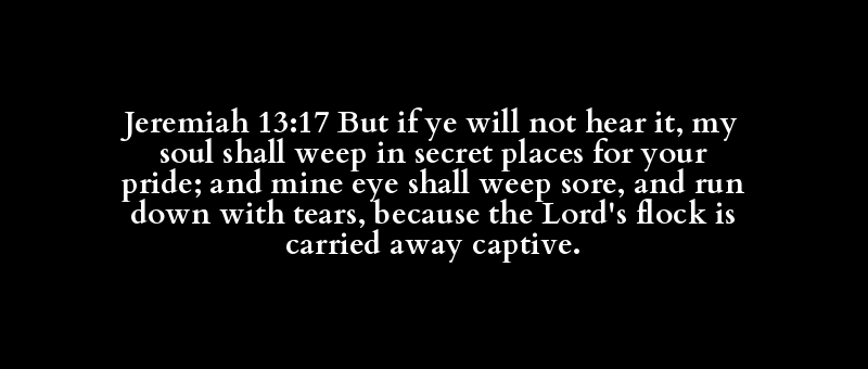 Jeremiah 13:17 But if ye will not hear it, my soul shall weep in secret places for your pride; and mine eye shall weep sore, and run down with tears, because the Lord's flock is carried away captive.