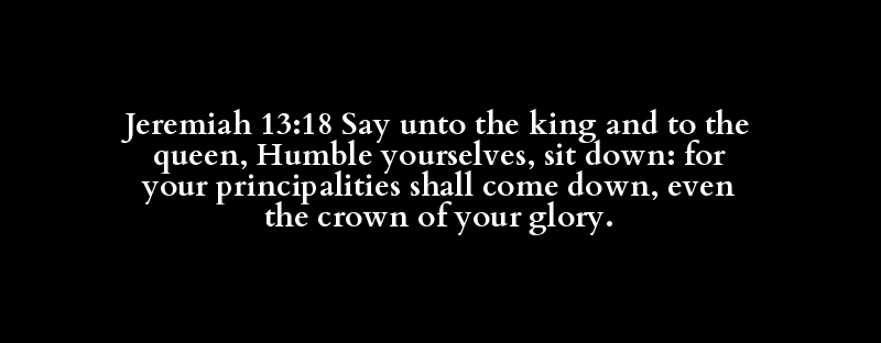 Jeremiah 13:18 Say unto the king and to the queen, Humble yourselves, sit down: for your principalities shall come down, even the crown of your glory.