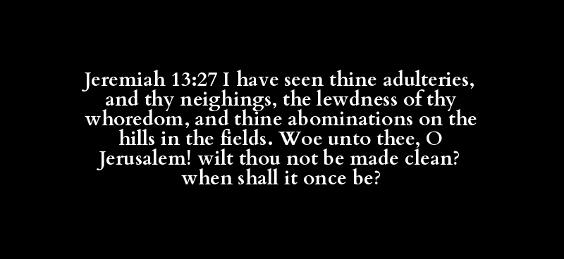 Jeremiah 13:27 I have seen thine adulteries, and thy neighings, the lewdness of thy whoredom, and thine abominations on the hills in the fields. Woe unto thee, O Jerusalem! wilt thou not be made clean? when shall it once be?